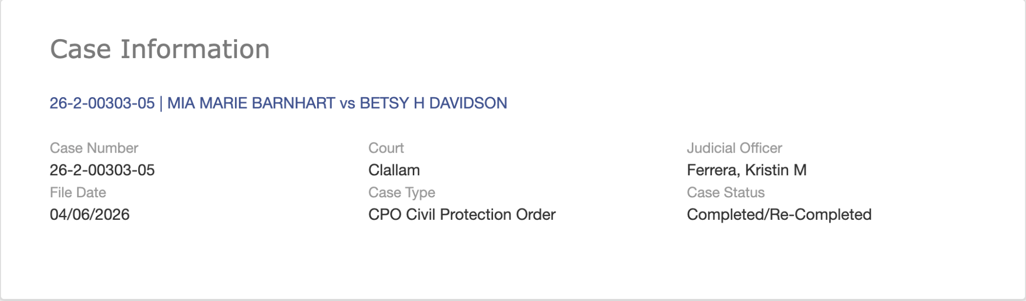 Court dockets reveal the staggering hypocrisy. On April 6, 2026, Mia Marie Barnhart—the spouse of Clallam County Presiding Judge Simon Barnhart—filed a Petition for Order of Protection.