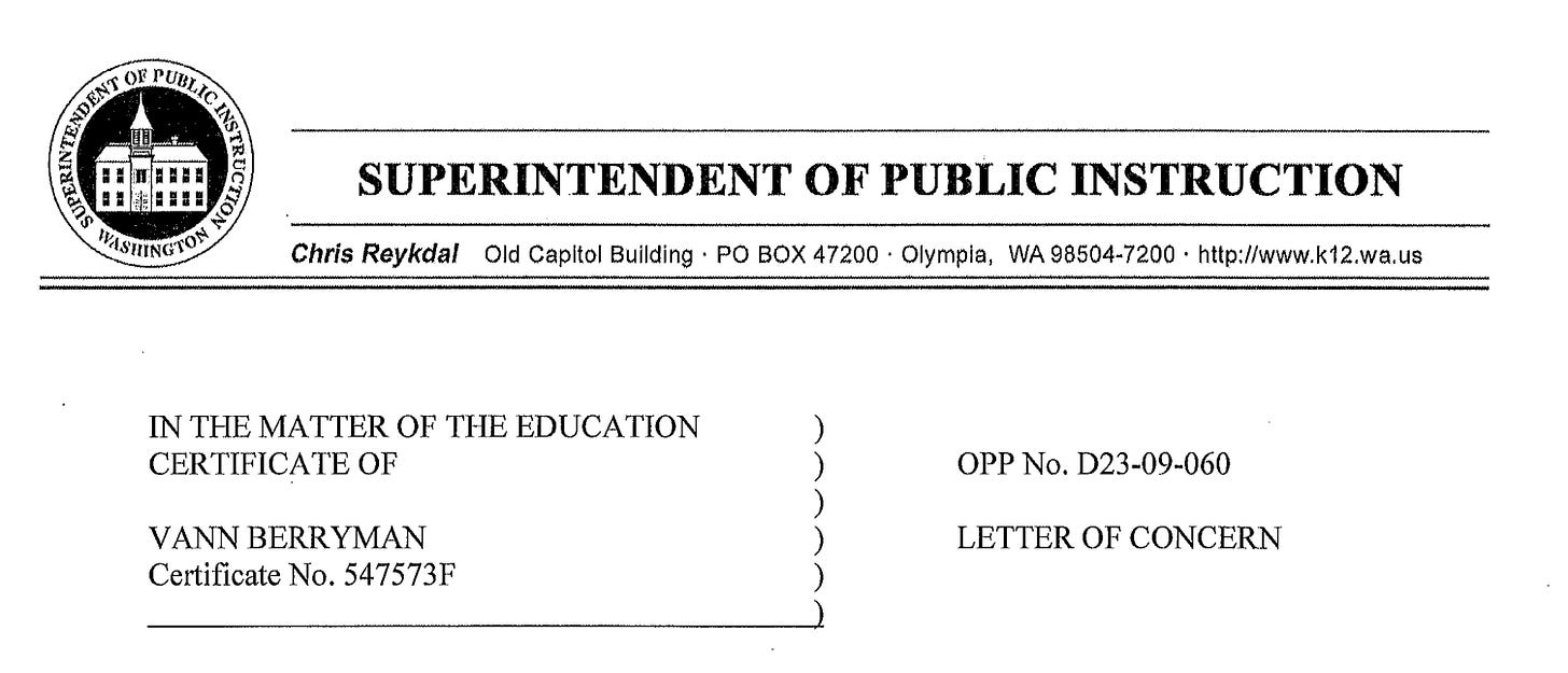 Former Bainbridge Island High School math teacher and debate coach Vann Berryman was issued a formal Letter of Concern by the Office of Superintendent of Public Instruction.