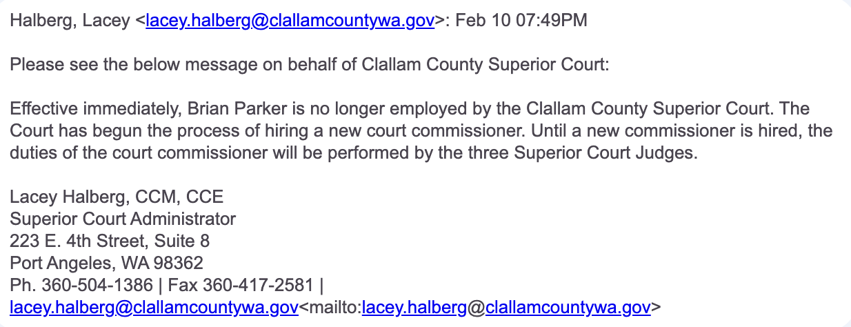 The Olympic Herald confirmed this afternoon that Brian Parker is no longer employed as a Court Commissioner for the Clallam County Superior Court.