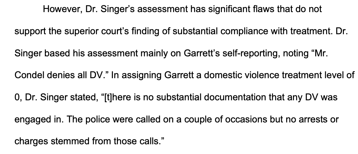 However, the Court of Appeals found that the lower court abused its discretion by relying on this assessment to find that the respondent had changed his behavior. The appellate panel identified critical failures in Dr. Singer’s methodology, noting that the assessment relied primarily on the respondent’s self-reporting, specifically citing Singer’s note that the man “denies all DV.”