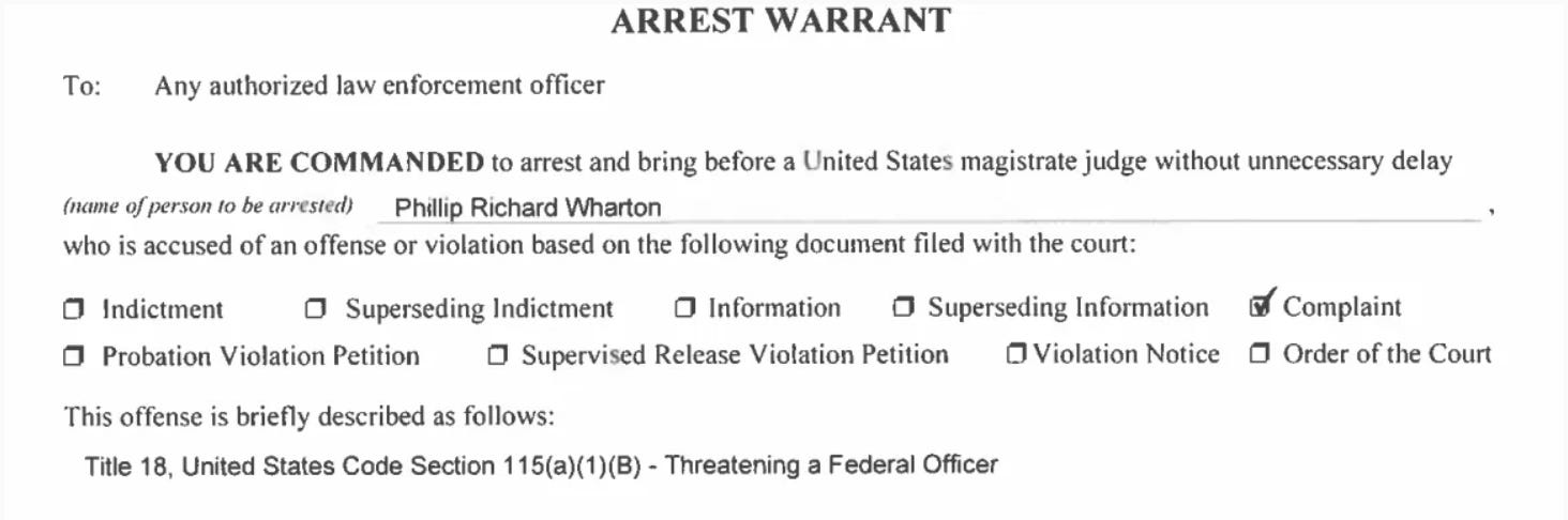 Following the issuance of a criminal complaint, Wharton was arrested on February 10, 2026.