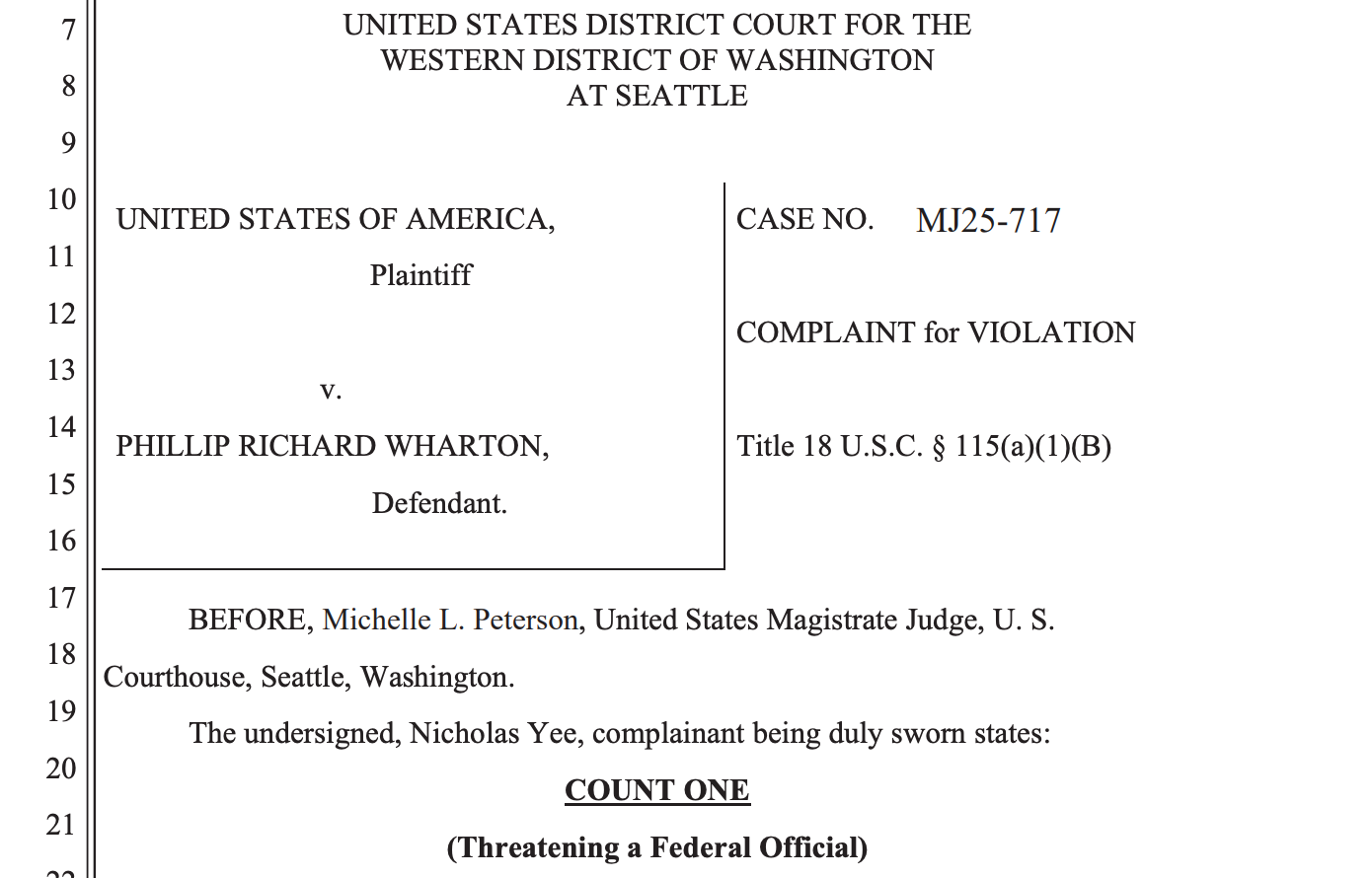 During an initial appearance that same day, Magistrate Judge Michelle L. Peterson ordered Wharton released on a personal recognizance bond.