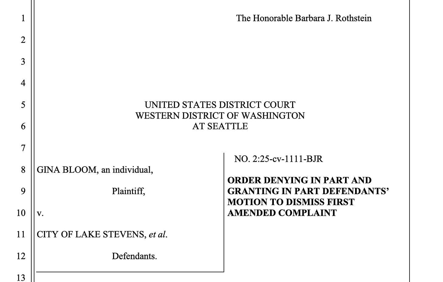 According to the ruling, the court has allowed Bloom’s core allegations of retaliation and malicious prosecution against the City of Lake Stevens and its police officers to move forward.