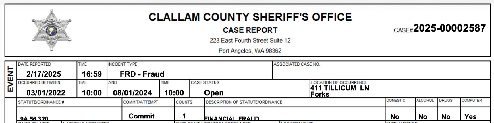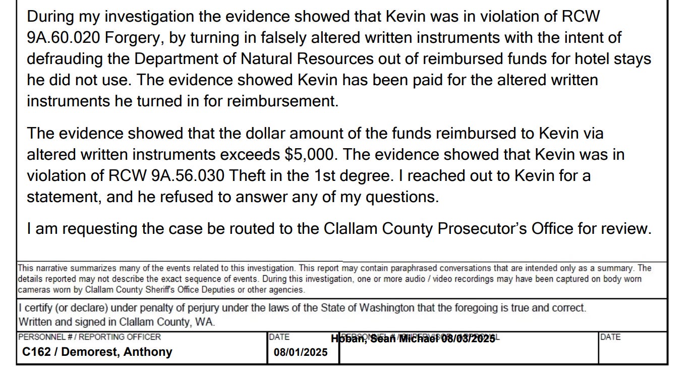 Following the conclusion of the Sheriff’s investigation in August 2025, Deputy Demorest requested charges of Forgery (RCW 9A.60.020) and Theft in the 1st Degree (RCW 9A.56.030) be referred to the Clallam County Prosecutor’s Office.