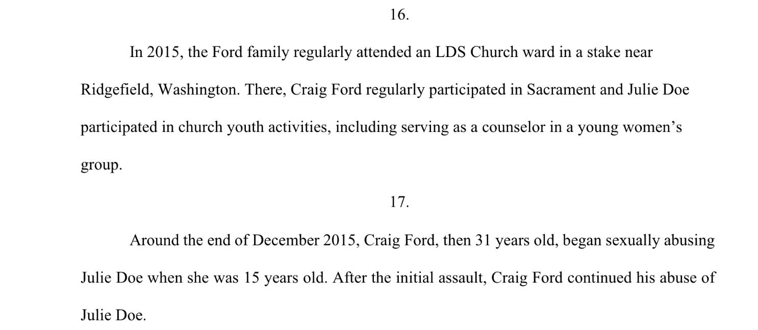 While living alone with the minor in Oregon, Craig Ford subjected her to near-daily sexual abuse and rape. During this time, they continued to participate in local LDS services. Despite Albany church leaders allegedly observing that Craig Ford displayed risqué images he likened to Julie Doe, and noting “unusual” interactions between the two, the church took no action to protect her.