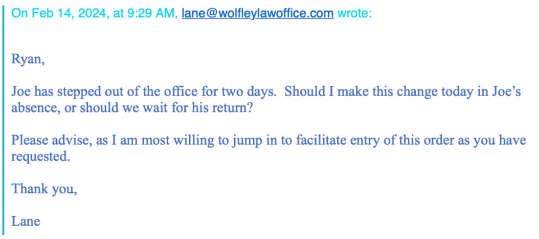 It was during this early period of instability that Lane Wolfley, Joseph’s father and law partner, first involved himself. In an email dated February 14, 2024, Lane wrote to opposing counsel: “Joe has stepped out of the office for two days... Please advise, as I am most willing to jump in to facilitate entry of this order as you have requested.”