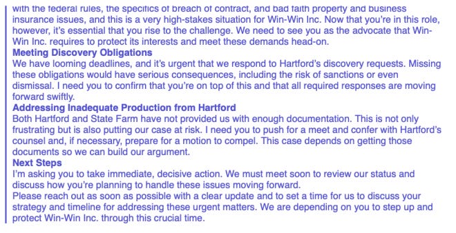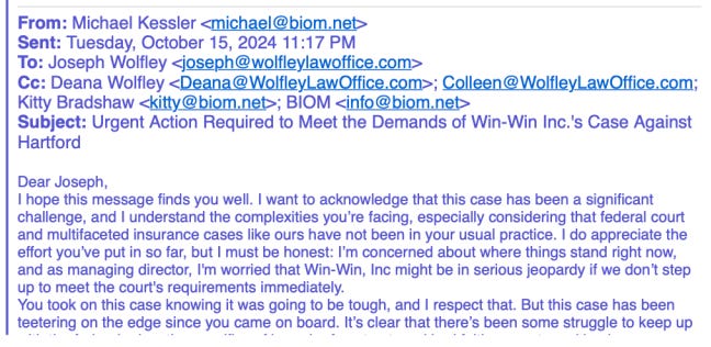 By October 2024, the relationship between the firm and the client had deteriorated. Win-Win Inc.’s Managing Director, Michael Kessler, sent an urgent email to Joseph Wolfley detailing frustrations regarding missed discovery deadlines and the risk of case dismissal.