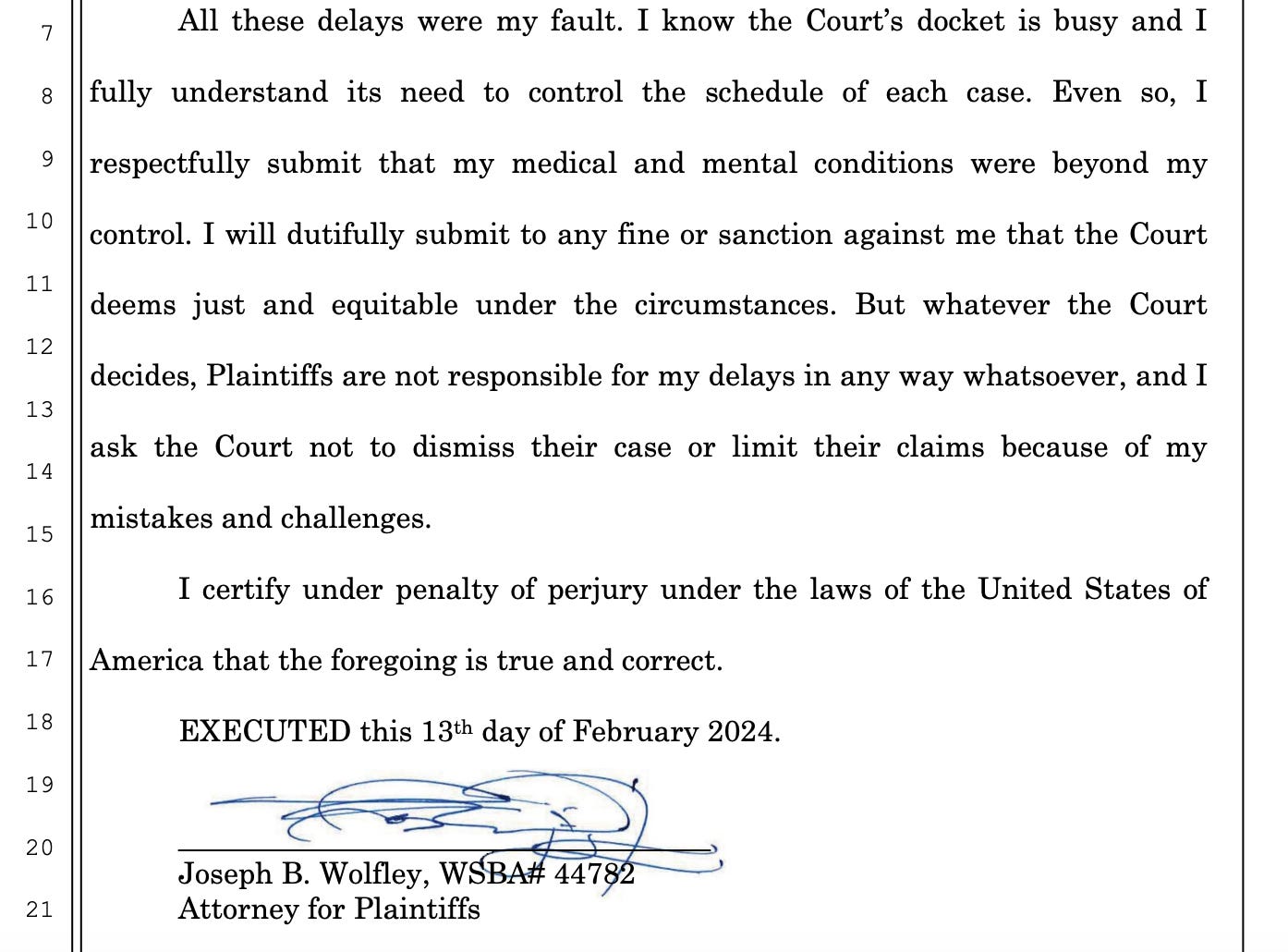 By February 2024, Joseph Wolfley admitted to failing to follow court orders. In a declaration filed on February 13, 2024, he apologized for his “failures to comply with the Court’s scheduling order” and his “tardiness,” stating he would submit to any sanction the Court deemed just.