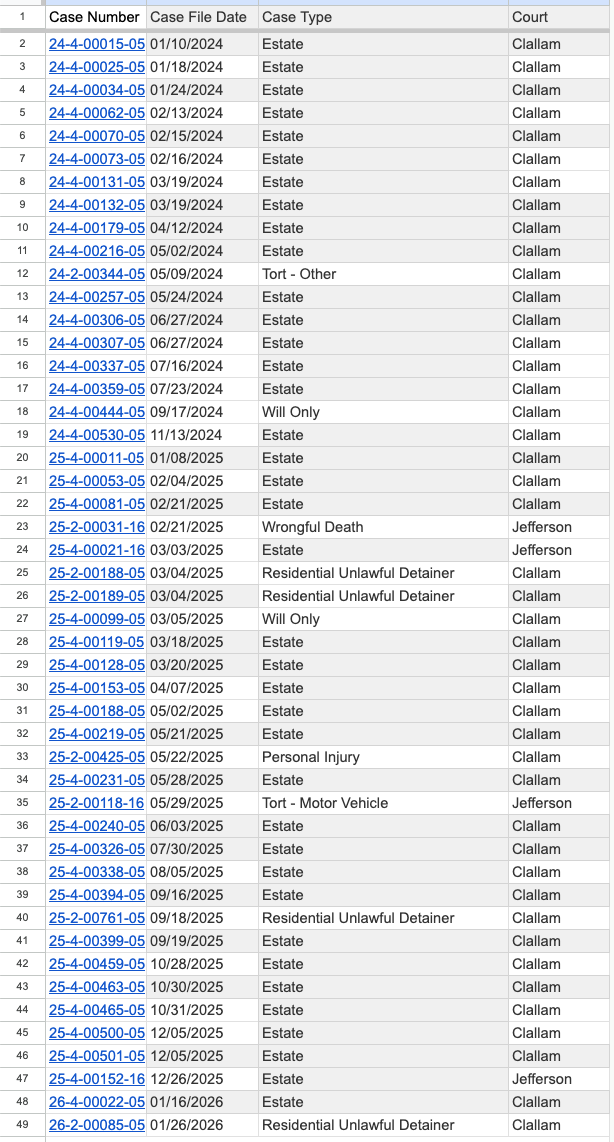 Yet despite the claim of retirement, Clallam County and Jefferson County Superior Court records show that Lane was actively (and is still) providing litigants representation in other cases. Lane Wolfley provided representation in the cases listed below.