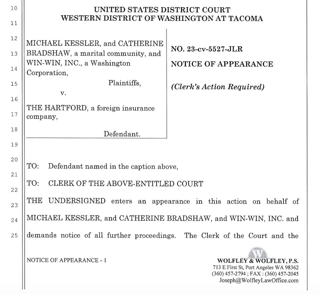 In December 2023, Joseph Wolfley entered an appearance as counsel for Win-Win Inc, in a lawsuit against an insurance carrier filed in the U.S. District Court for the Western District of Washington.