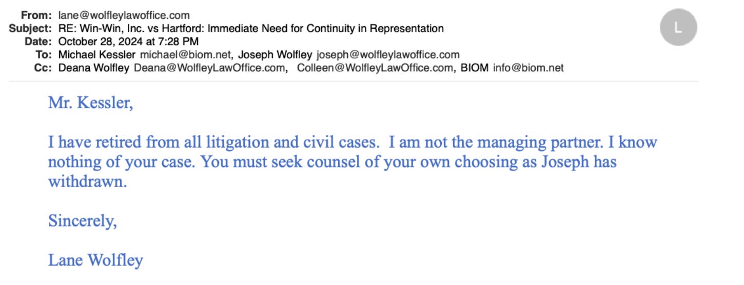 Facing a crisis, the client appealed to Lane Wolfley on October 28, 2024. Citing Lane’s status as senior partner and his previous offer to “jump in,” Kessler requested immediate continuity of representation.