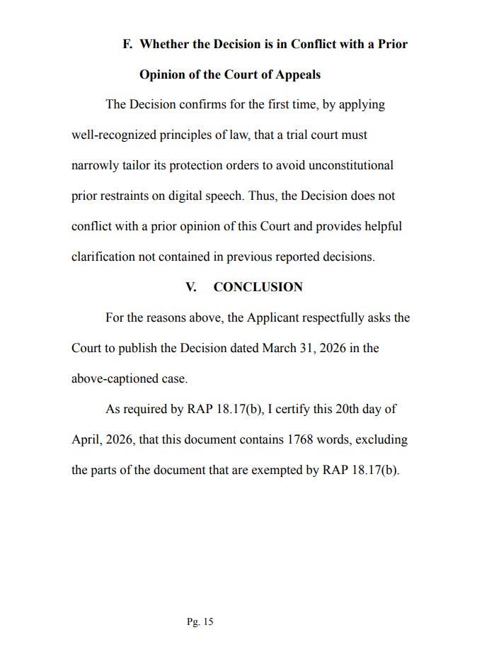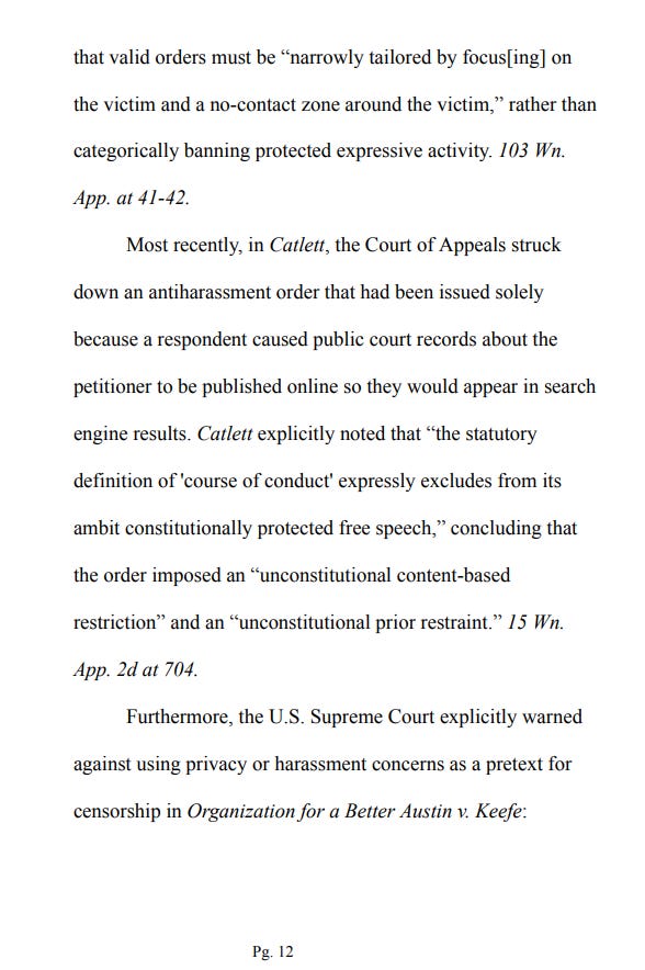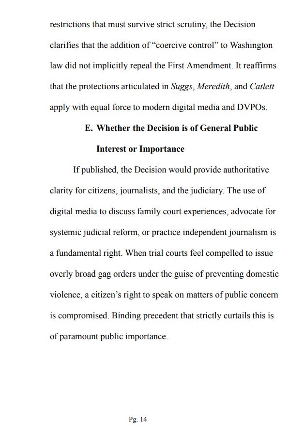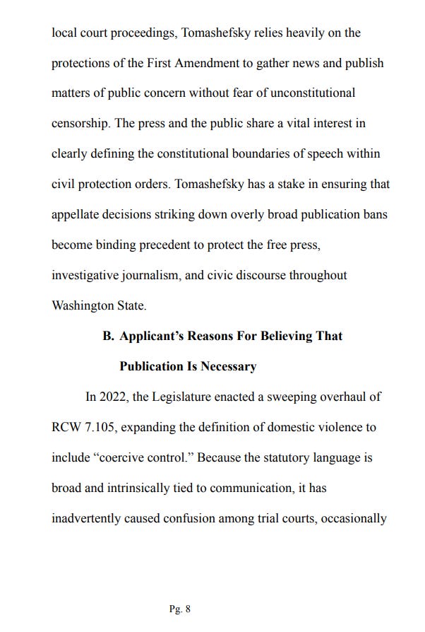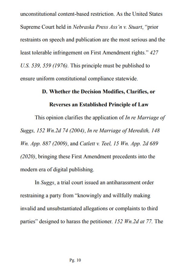 In my filing, I argue that publishing the decision to make it binding law is critical to protect independent journalism, a free press, and the First Amendment rights of all Washington residents in the digital age.