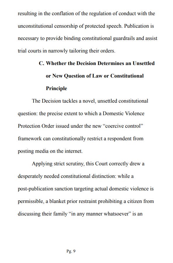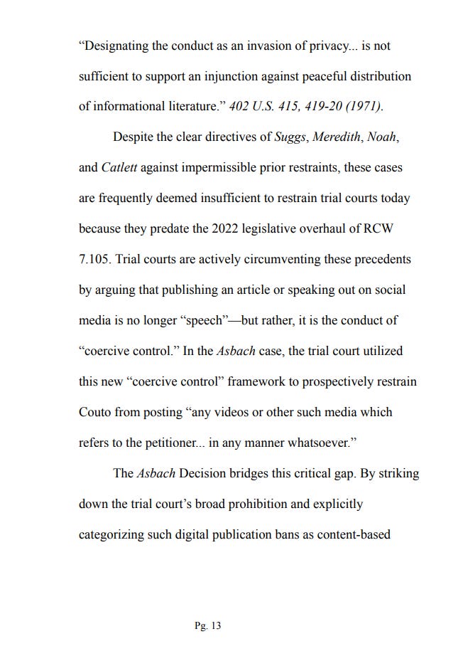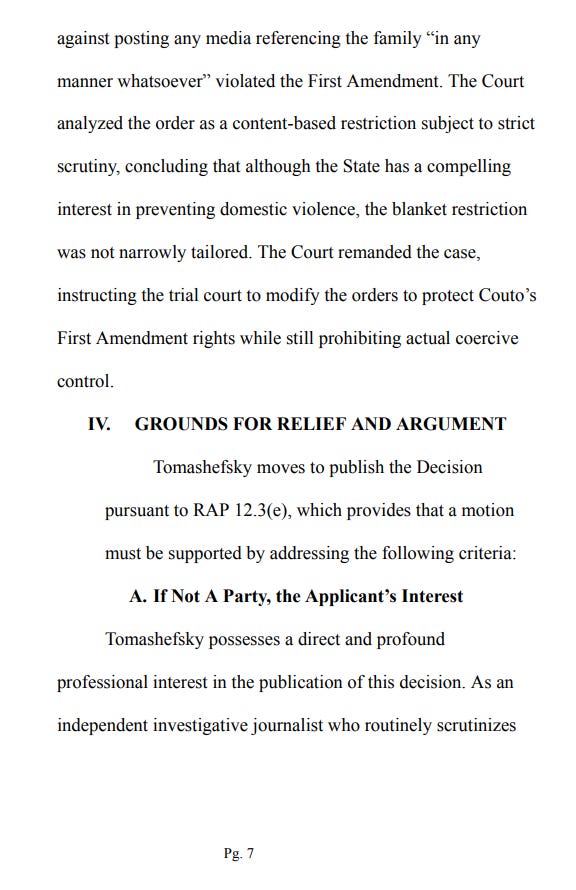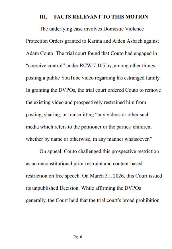 Earlier today, I filed a non-party motion asking Division II of the appellate court to make a portion of its March 31, 2026, decision in the case of Couto v. Asbach binding precedent.