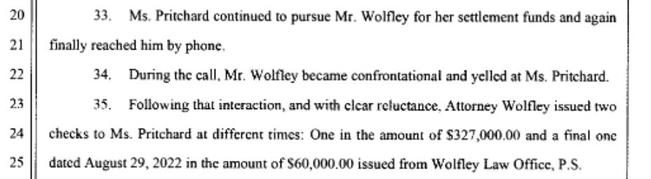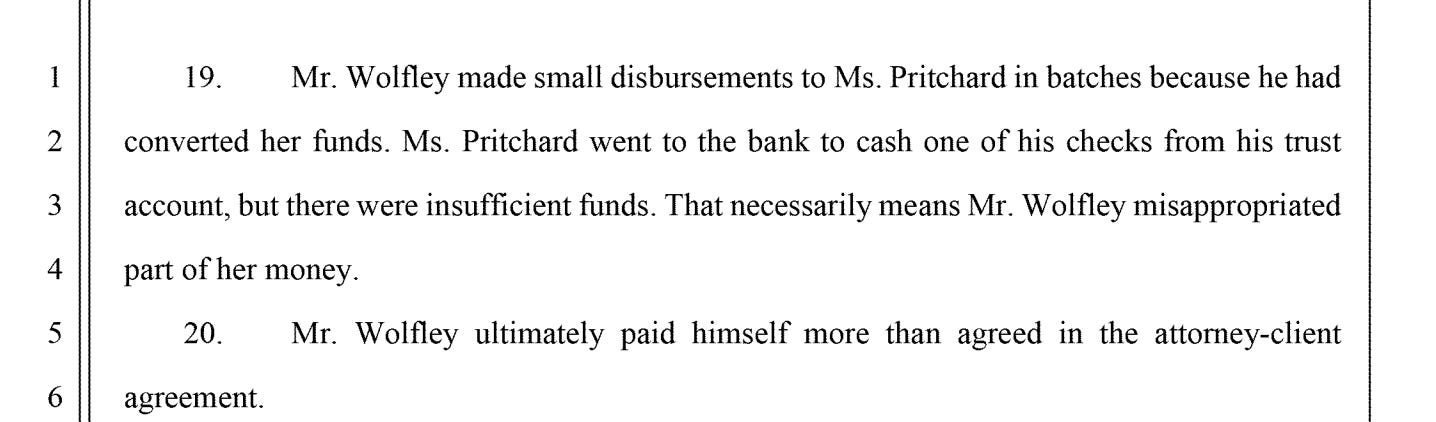 Pritchard further alleges that Wolfley delayed disbursing the remaining funds to her, ignored her phone calls, and commingled her settlement money with his own. When he finally issued a check to Pritchard for $60,000 in August 2022, the lawsuit claims it bounced due to insufficient funds in his trust account.