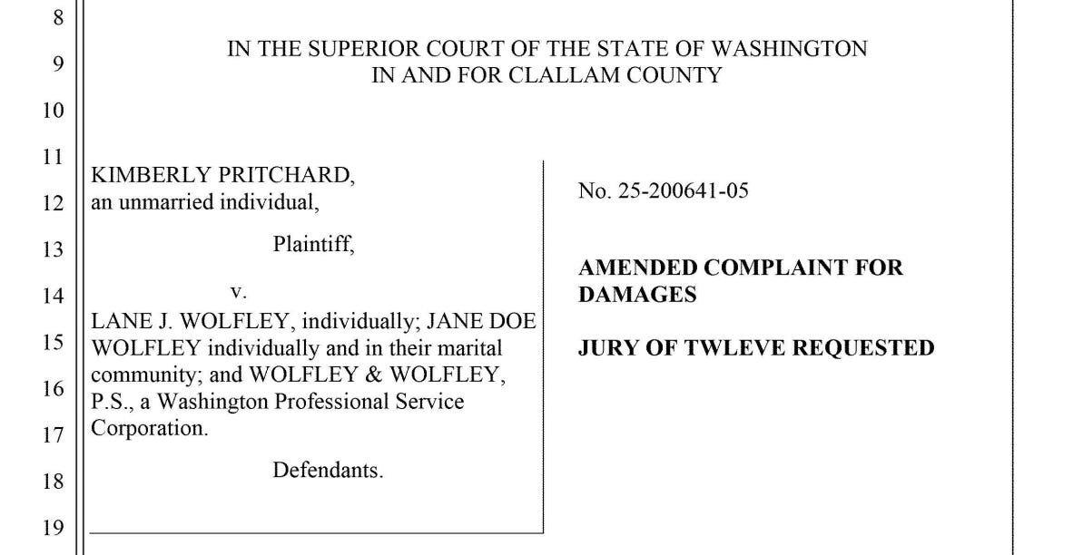 The Complaint, filed in Clallam County Superior Court by plaintiff Kimberly Pritchard, accuses Wolfley of mishandling a $1 million medical malpractice settlement, taking unauthorized fees, and engaging in deceptive financial practices.