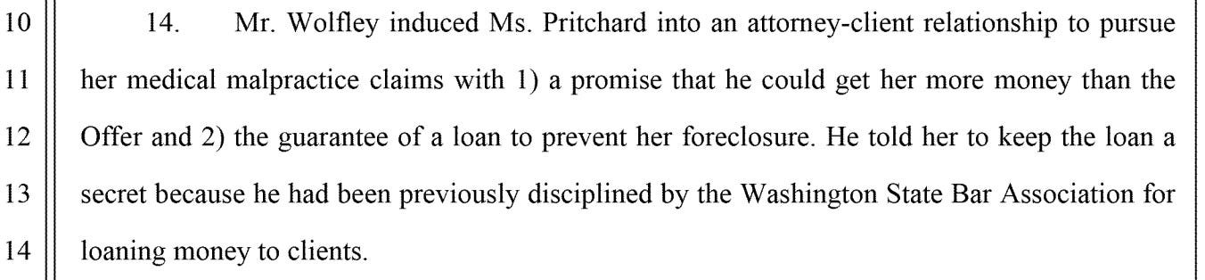 Pritchard alleges Wolfley instructed her to keep the loan secret because of his history of bar discipline for loaning money to clients.