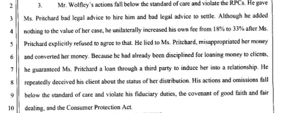 The 2005 suspension also addressed improper financial entanglements with clients—an issue that echoes the allegations in the current Pritchard lawsuit. The WSBA found that Wolfley violated professional conduct rules by providing financial assistance to two separate clients.