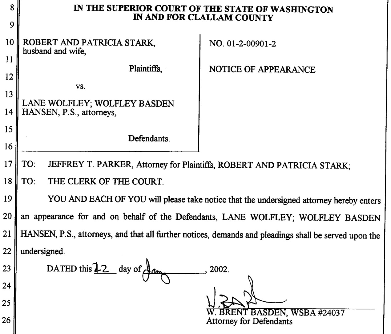 In November 2001, another malpractice lawsuit was filed against Wolfley and his then-firm, Wolfley, Basden & Hansen, P.S., by Robert and Patricia Stark.