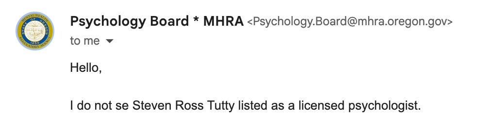 We also submitted a public records act request for Tutty’s psychology licensing records in the state of Oregon during his time at Dragonfly.