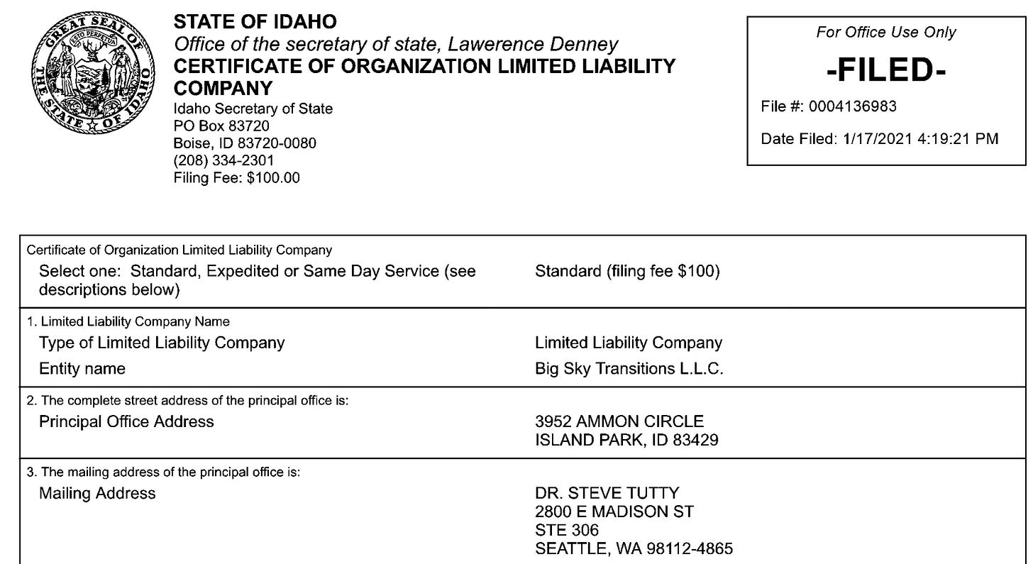 Records show that Tutty filed the Certificate of Organization for “Big Sky Transitions L.L.C.” in Idaho on January 17, 2021.