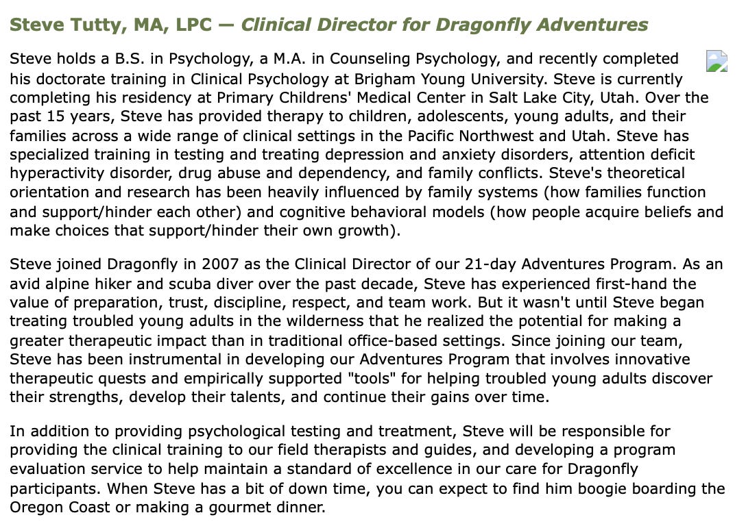 Tutty’s CV used in courts omits his 2007 tenure at Dragonfly, where he oversaw psychological testing and treatment in the wilderness. This omission may be strategic. Dragonfly was founded by Glenn White and Mona Treadway, former leaders of the Crater Lake School. The Crater Lake School was forced to close by the state of Oregon in 2004 following investigations into “mistreatment of teen residents, sexual impropriety, lax oversight and poor record keeping.”