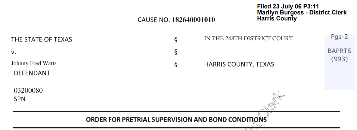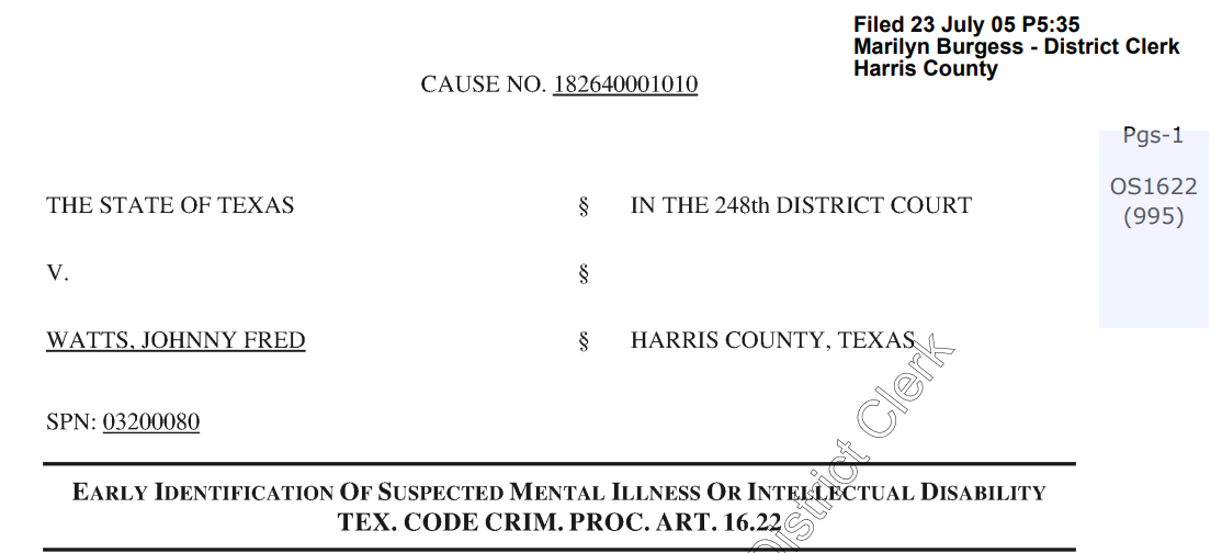 Mental Health Flag: On the day of his arrest, a Harris County Hearing Officer filed an “Early Identification of Suspected Mental Illness or Intellectual Disability” order. The court found “credible information that may establish reasonable cause to believe” Watts was a person with mental illness, ordering an immediate clinical interview.