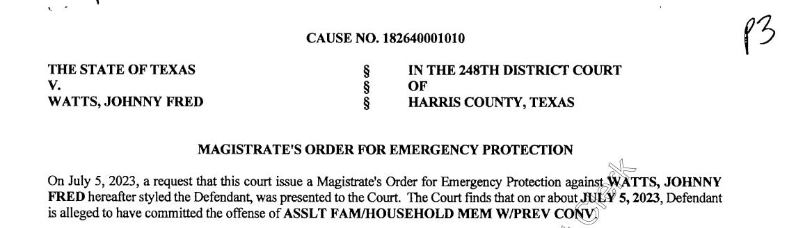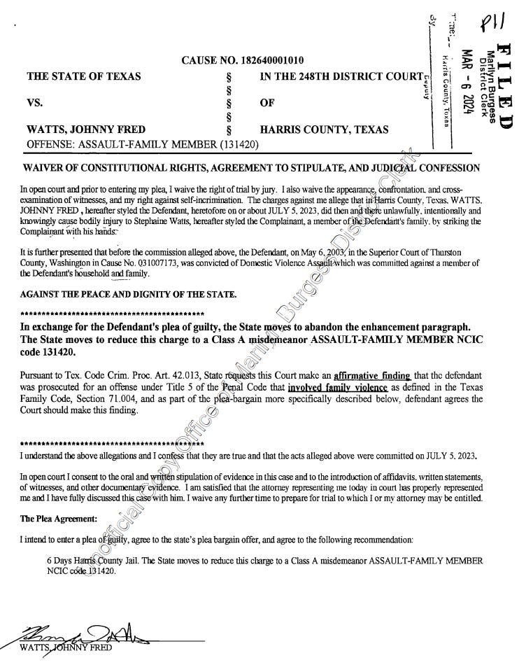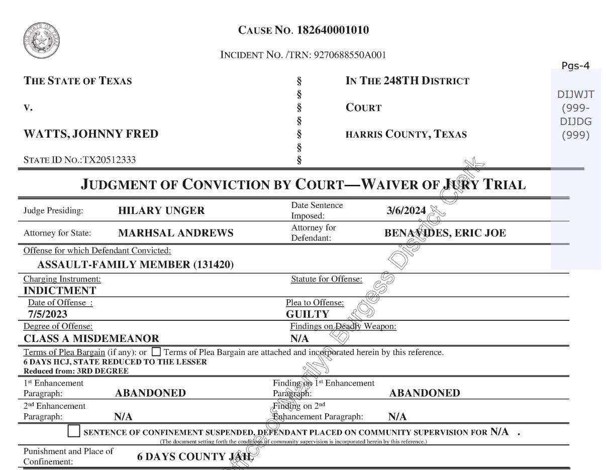 A Texas judge accepted the plea, officially entering an affirmative finding of family violence, and sentenced Watts to just six days in the Harris County Jail. Watts was credited with two days served and was issued a formal written admonition barring him from possessing a firearm.
