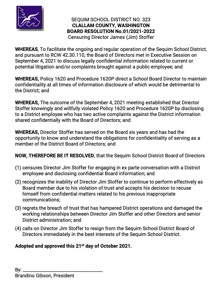 In October 2021, the Sequim School Board scheduled a special meeting to vote on a resolution calling for the immediate resignation and censure of Board Director Jim Stoffer.