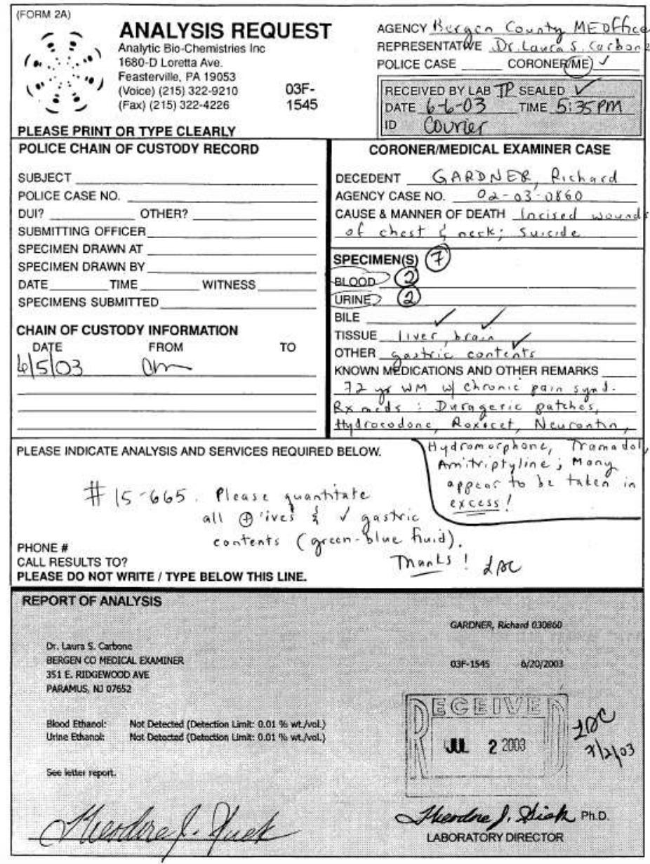 On May 25, 2003, Gardner took his own life by stabbing himself at his home in Tenafly, New Jersey.