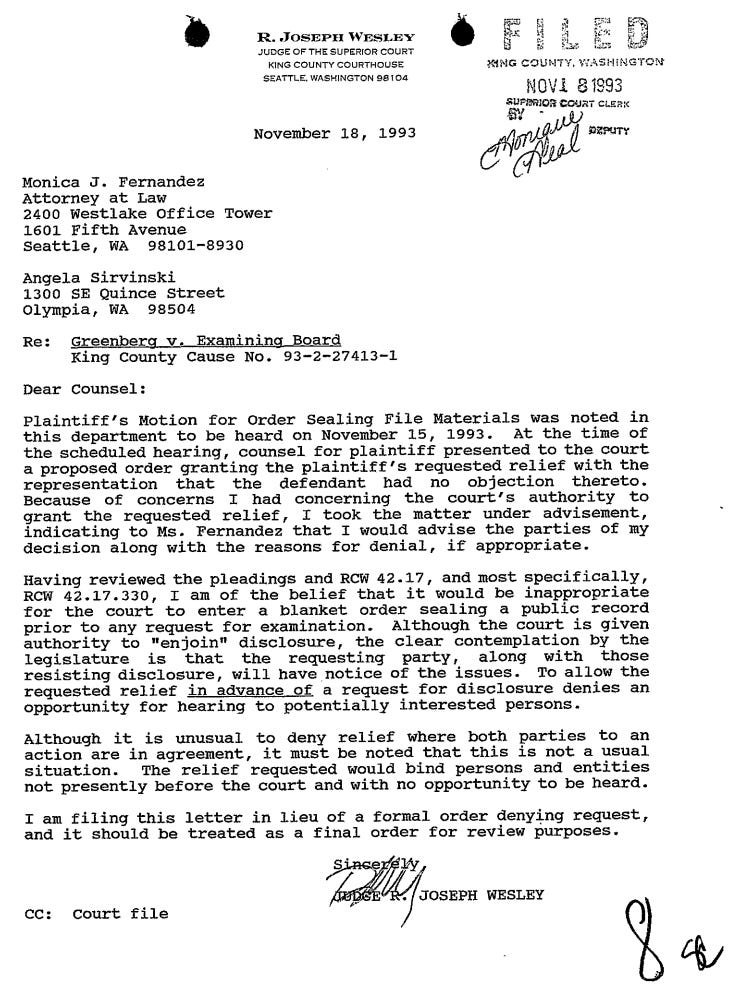 But one year later, Greenberg went down to Thurston County, and Judge Daniel Berschauer agreed to place the state’s records off-limits to the public. Judge Bershauer also sealed the entire court file describing Greenberg’s secrecy request.