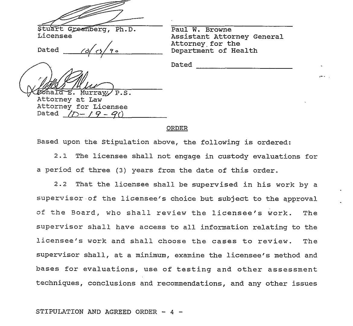 In the 1990s, Greenberg had been charged by the state examining Board of Psychology for misconduct in several custody evaluation cases. He pled guilty and was suspended from doing custody evaluations for three years.