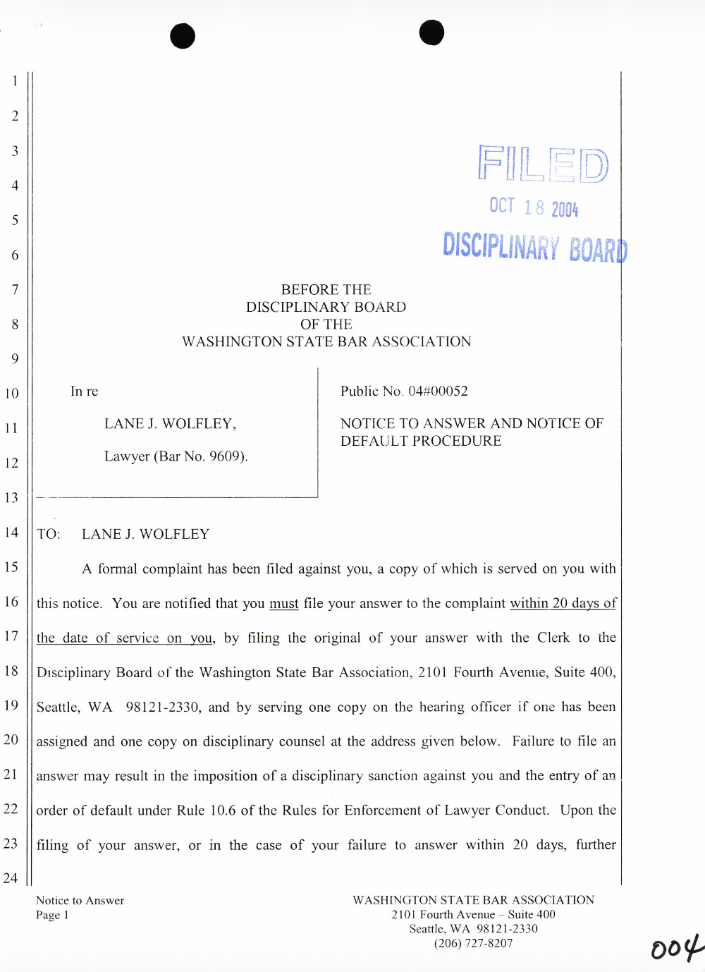 Then in August 2004, the Disciplinary Board of the Washington State Bar Association notified Lane Wolfley that there was “sufficient evidence of unethical behavior to take further action,” and a hearing was ordered. A former complaint was filed in October 2024.