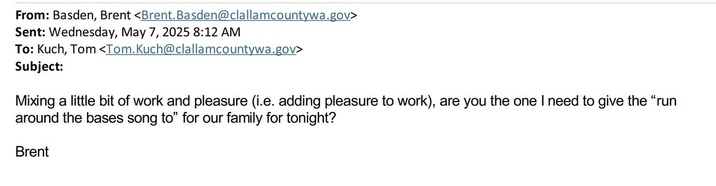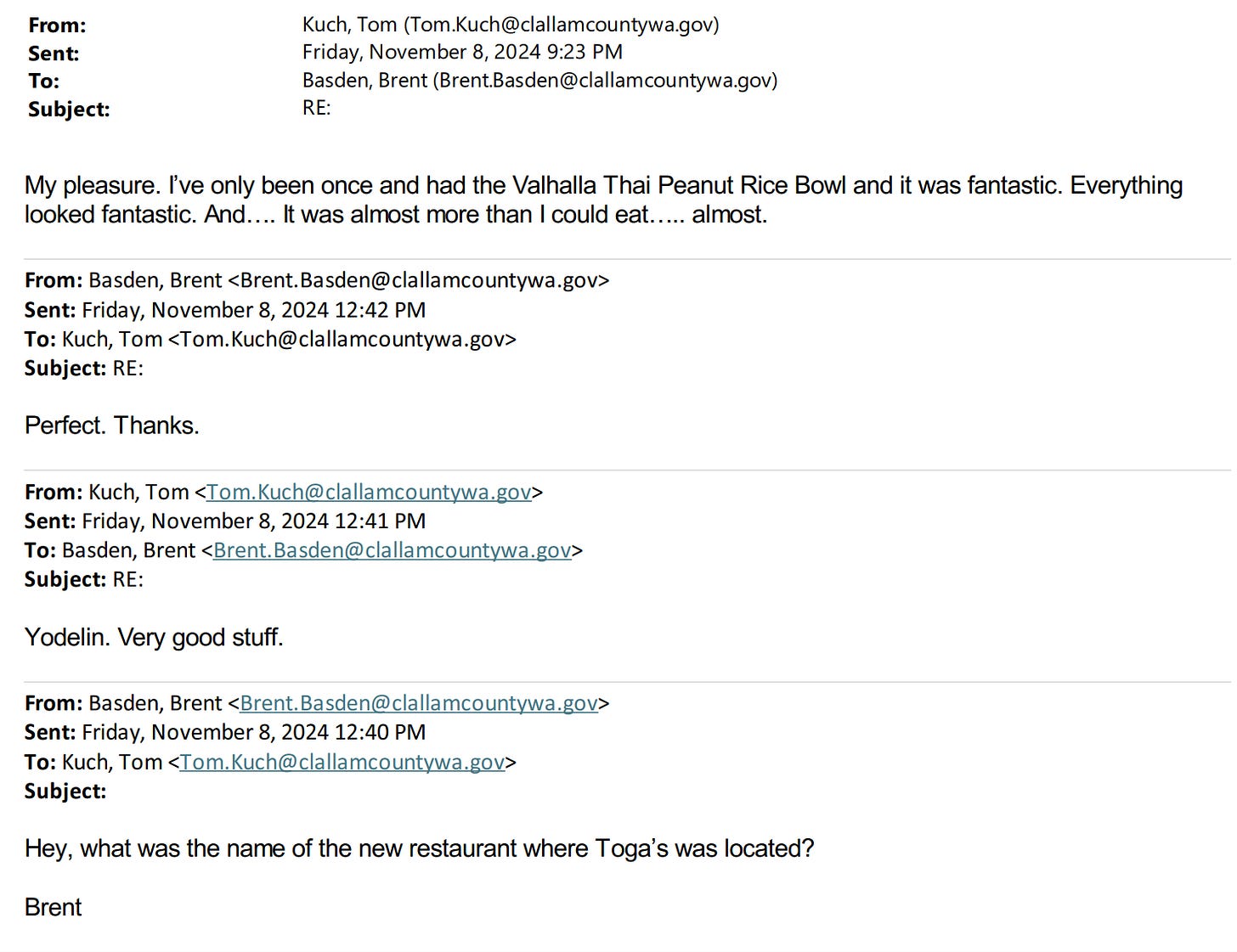 The internal communications suggest a casual, familiar relationship between Judge Basden and Tom Kuch, the Clallam County Civil Investigator tasked with Parker’s background check. In official emails sent during the vetting period, Basden utilizes government resources to ask Kuch for restaurant recommendations and song suggestions for a family event, blurring the lines between professional oversight and personal friendship.