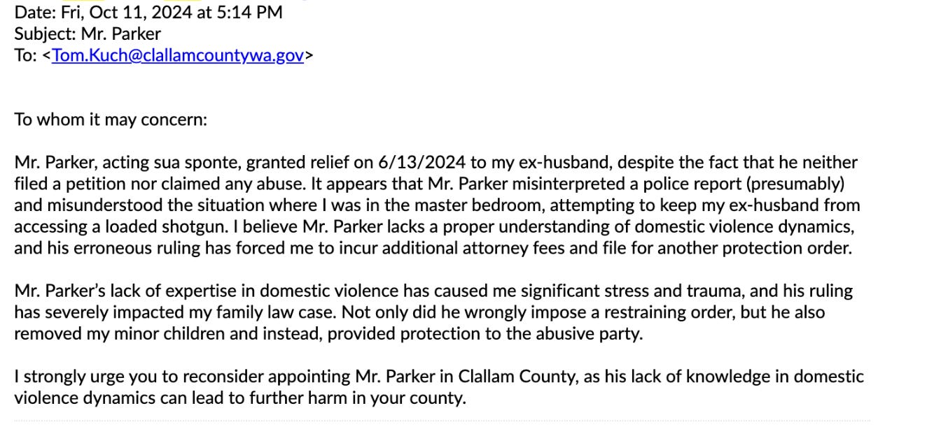 Earlier that month, on October 11, another citizen had emailed Kuch detailing Parker’s alleged lack of expertise in domestic violence dynamics, warning that his rulings had “severely impacted” families and urging the county to reconsider his appointment.