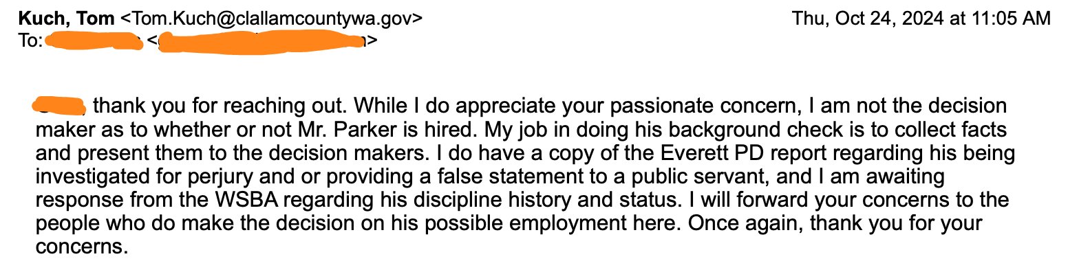 On October 24, 2024, just days before the hiring decision, Kuch sent an email to a concerned citizen acknowledging he was in possession of an Everett Police Department report investigating Parker for “perjury and or providing a false statement to a public servant.”