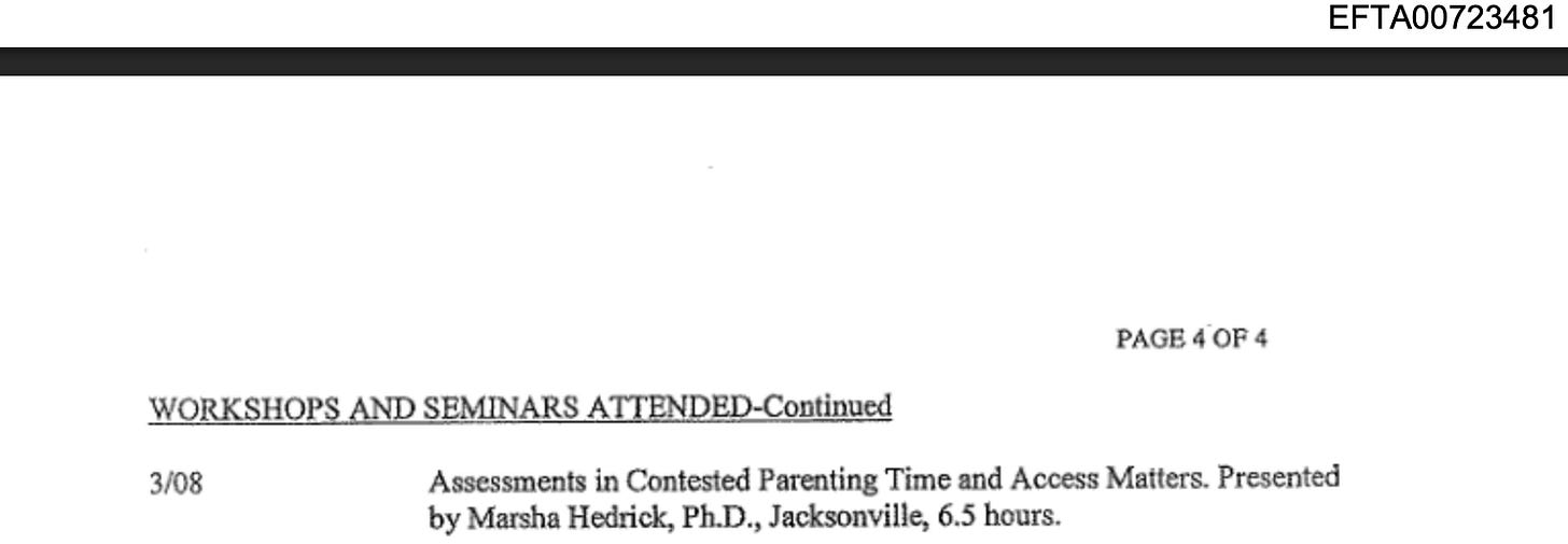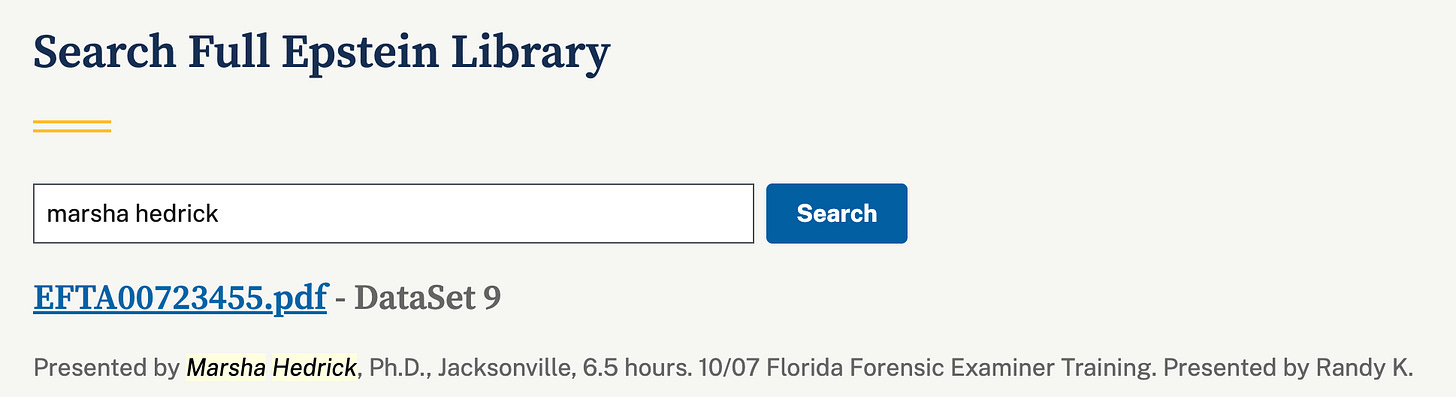 While there is no indication that Hedrick (or McHugh) had any personal or professional association with Epstein, her role in training experts whose work appears in high-stakes DOJ records underscores her influence in the field of forensic evaluations.