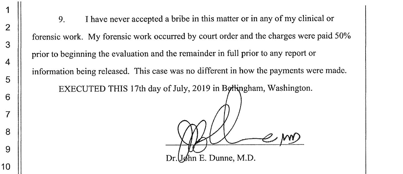 Dr. Dunne ends his declaration by bizarrely stating to the court that he has “never accepted a bribe” in “any of [his] clinical or forensic work.”
